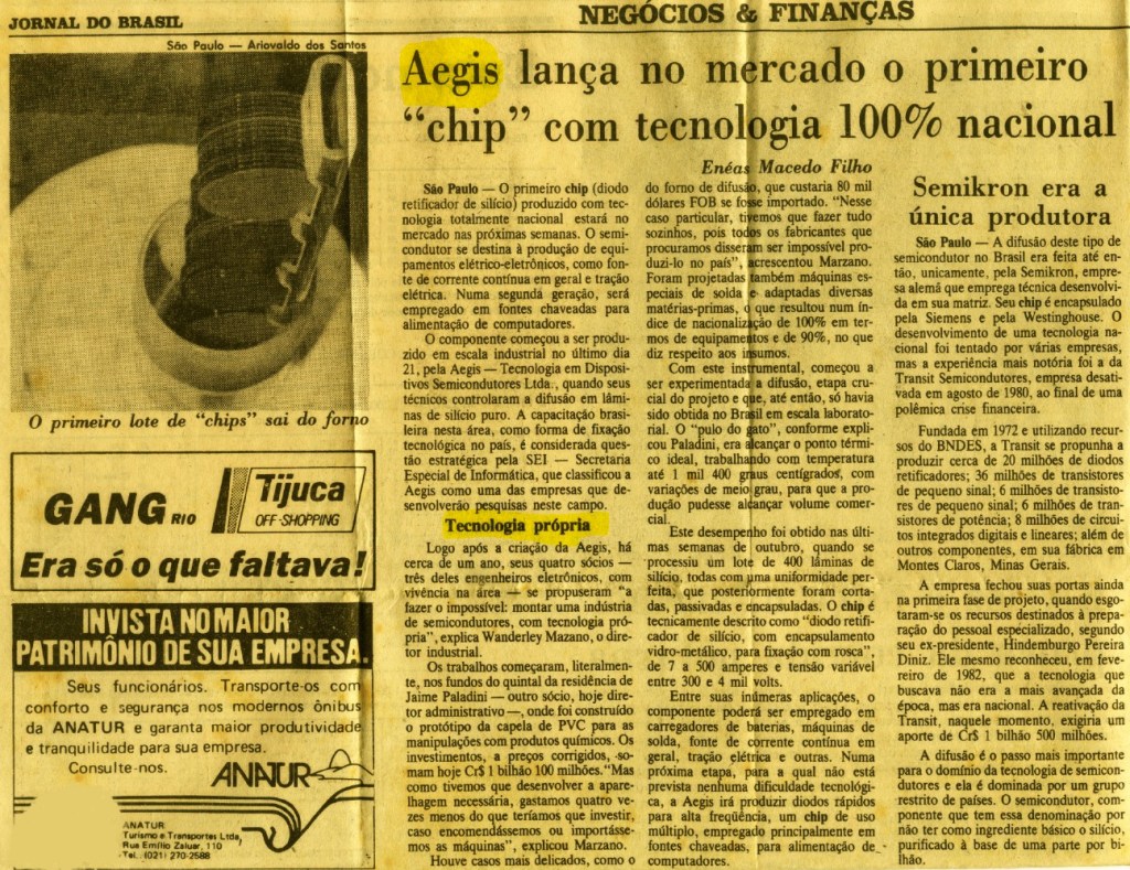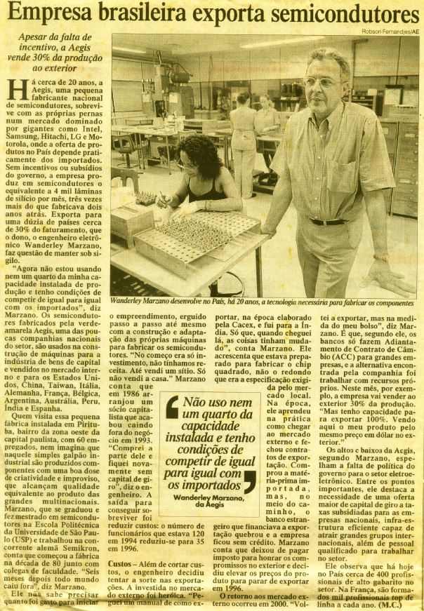 In this article Aegis launched the first 100% national chip. They described a few of the challenges faced to reach this achievement, among then was the difficulty to import equipment. For example, in this article, the director Marzano, Wanderley, mentioned about the diffusion furnace where the wafers should be diffused. Due to the difficulties in importing (giants taxes and suppliers at that time who couldn´t deliverer in Brazil), the furnace was manufactured inside the company. It costed 25% than a new one from any manufacturer.